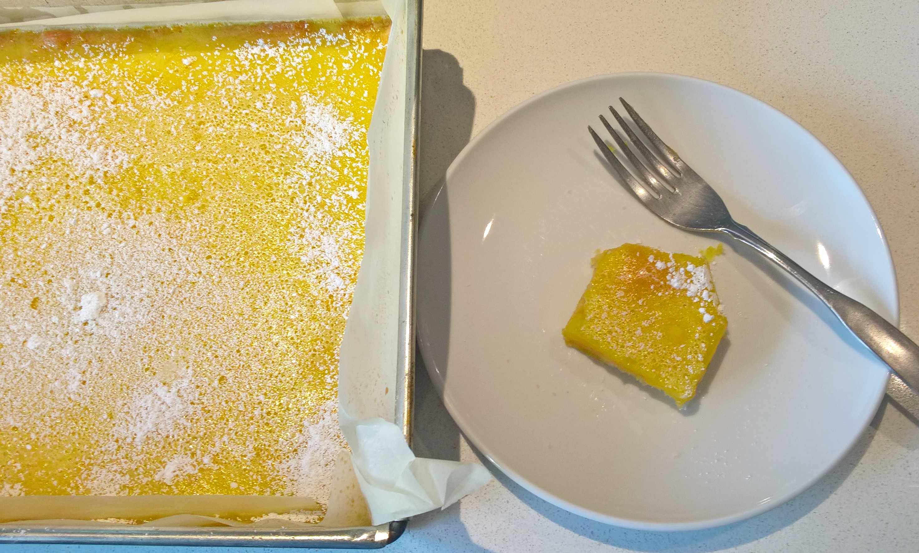 Next, falling in with the sheet-pan cooking craze: Blueberry muffin blob from Food 52. Since I didn’t bake this when blueberries were in season, out came the humongous bag of frozen wild blueberries from Costco. And if you keep ingredients like this a smidge (spelled W-A-A-A-Y-Y) past the best-by date, you get the bonus frost that melts when mixed, giving that ‘unique’ (yes, that’s the word I’m looking for. . .) purplish haze to the batter.