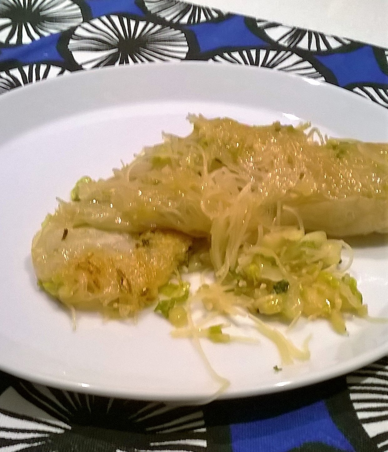 More interwebs searching brought him to Martha and a doable recipe. Chinese cabbage, rice noodles, and onions. Not really a meal, but accomplishes the desired effect of using up the ancient spring roll wrappers.